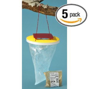 Flies Be Gone Fly Trap Five Pack- 18 billion flies can't be wrong! Flies Be Gone Fly Trap really works, safe and easy! Proven by U.S. Military use in Iraq, proven in livestock corrals, kennels, restaurant trash areas... this reduces fly problems without toxic chemicals, maintenance or messy clean-ups. It's been working for over 25 years in 27 countries worldwide. You just pour the included bait inside and add water. The bait remains active for about 30 days. Flies fly in and never get out, and it decimates the breeding population. Protects an area about half the size of a football field. For outdoor use only. Environmentally safe and disposable. Hang-up bag is approx. 8" diam., 11"h. Institute your own "no fly" policy... get the best in pest control now! read more..